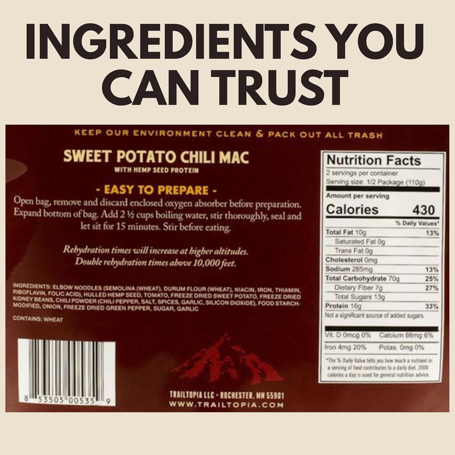 Trailtopia Chicken Stew with Noodles – Freeze Dried Hiking Dinner | Delicious Taste | Quick & Easy Prep | Lightweight | Perfect for Camping & Backpacking | High Energy Meals for Outdoor Adventures(Sweet Potato Chili Mac)