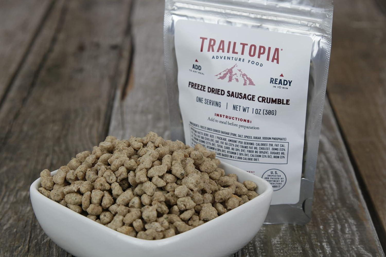 Trailtopia Hulled Hemp Seed Side Pack – Delicious Meal Add-On for Backpackers and Outdoor Enthusiasts | Nutritious, Protein-Packed, and Quick to Prepare Freeze Dried Meal(Sausage Crumble)