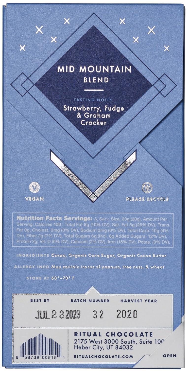 Ritual Dark Chocolate Bar, Fleur De Sel 70% Cacao, Notes of Strawberries, Fudge & Sea Salt, 2.12 oz(Mid Mountain Blend 70%)