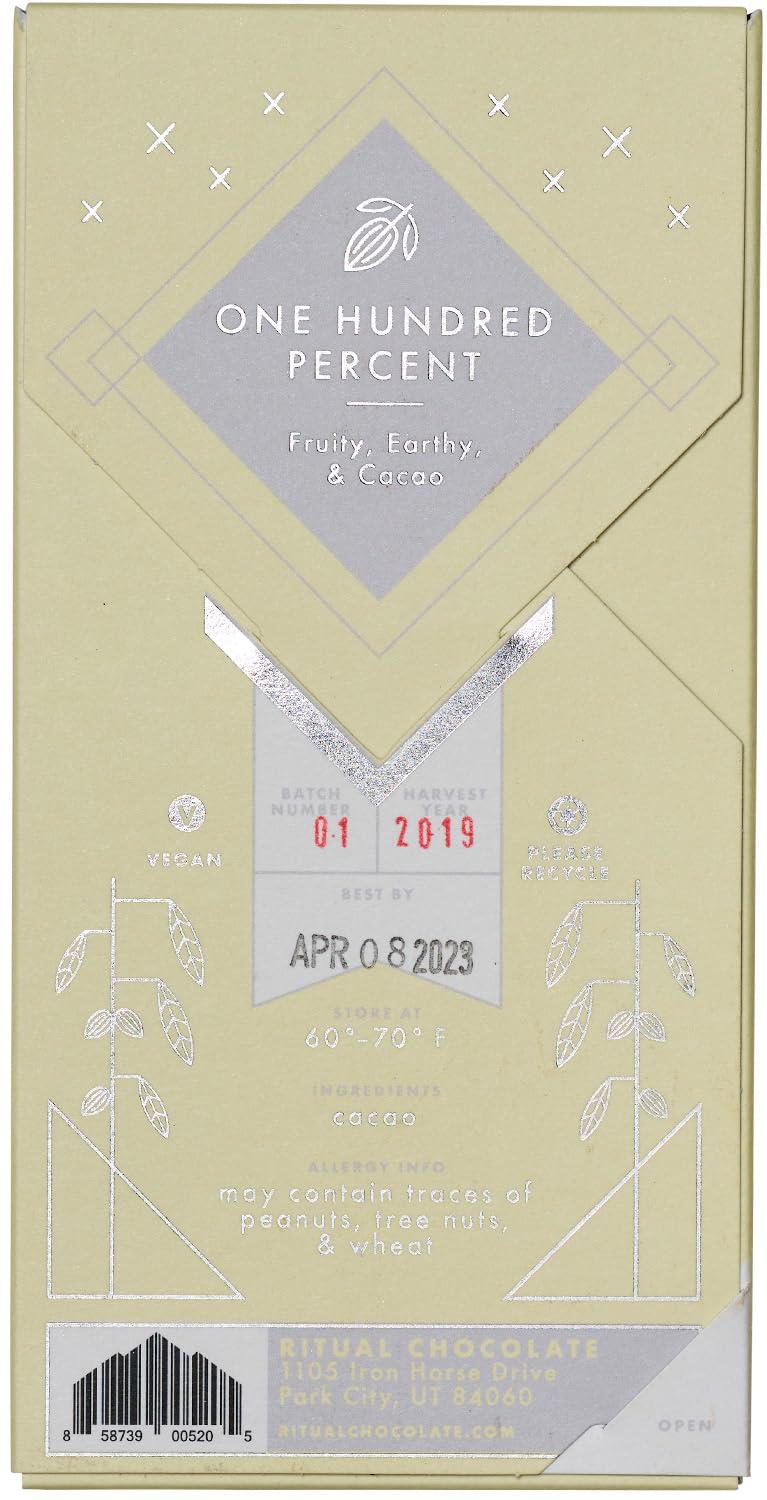 Ritual Dark Chocolate Bar, Fleur De Sel 70% Cacao, Notes of Strawberries, Fudge & Sea Salt, 2.12 oz(One Hundred 100%)
