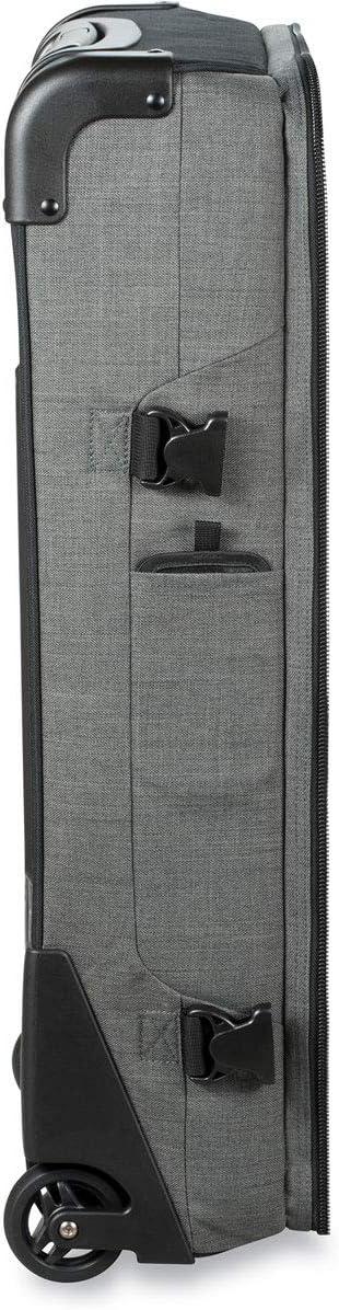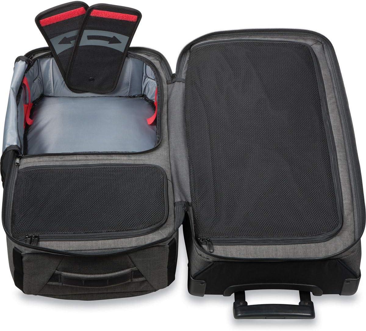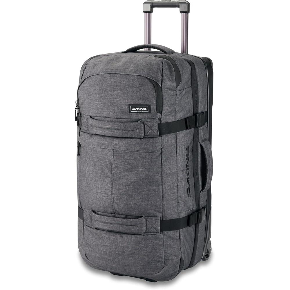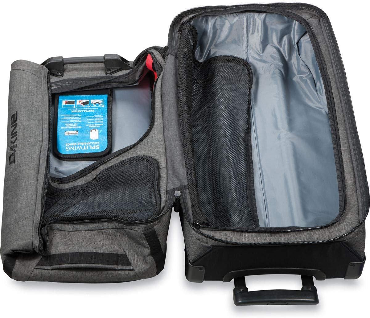 A GEAR HAULER EXTRAORDINAIRE WITH THE SPLIT-LEVEL ORGANIZATION TO MATCH Living the adventure life is gear intensive. When your next mission calls for a little of everything, the Dakine Split Roller 110L bag makes getting it all there easy. The bag divides organization into a split-level design that gives easy access to multiple large compartments. It's like a traveling locker room that you can live out of while on the road. Mesh dividers maintain visibility and the collapsible Split-Wing feature lets you compress the bag for easy storage when not in use. Bomber oversize zippers provide years of reliable closure, and durable wheels keep you rolling down sidewalks and even dusty roads with ease. DIMENSIONS: – 6710 cubic inches (110L); – 32 x 17 x 13″ (81 x 43 x 33cm); – 10lbs (4.5kg); FEATURES: – Split level design allows for easy access and organization; – Split-Wing Collapsible Brace (patented) provides great stability and folds flat for storage; – #10 lockable YKK main zippers; – Interior mesh dividers provide visibility of contents; – Neoprene panel on large interior compartment provides stretch for over-packing; – Interior compartment keeps dirty clothes or ski/snowboard boots contained; – Tuck away ID pocket for added security; – Exterior quick access pockets; – Premium retractable handle & reinforced, replaceable 8.5cm urethane wheels; – Compression molded bottom with corner guards; CARE: If your Dakine luggage gets dirty, we recommend spot cleaning with mild soap (like Nikwax Tech Wash), cold water and a soft bristle brush. Never attempt to put your Dakine luggage in a washing machine. Always ensure your Dakine luggage is dry (inside and out) before storing.