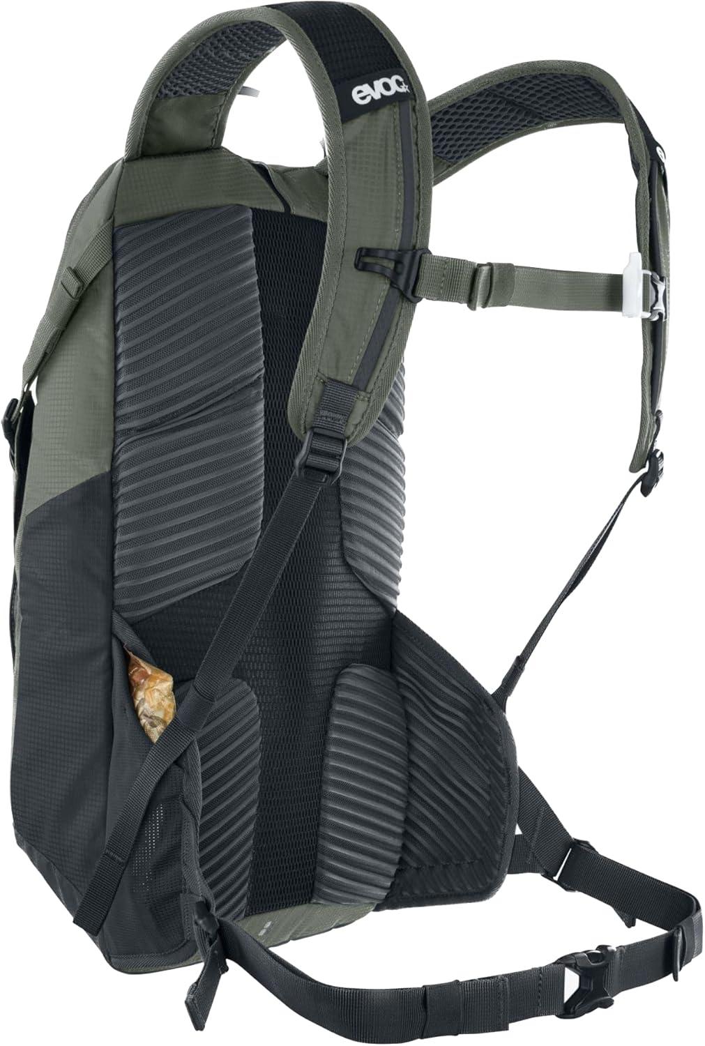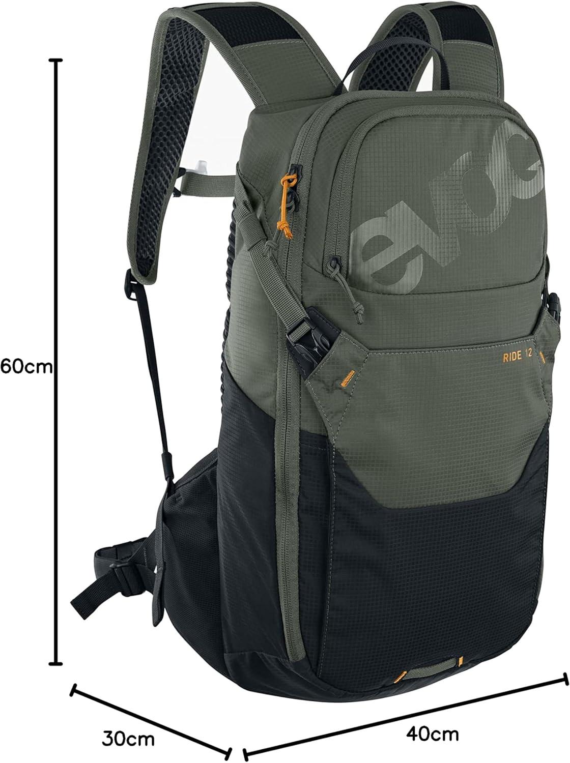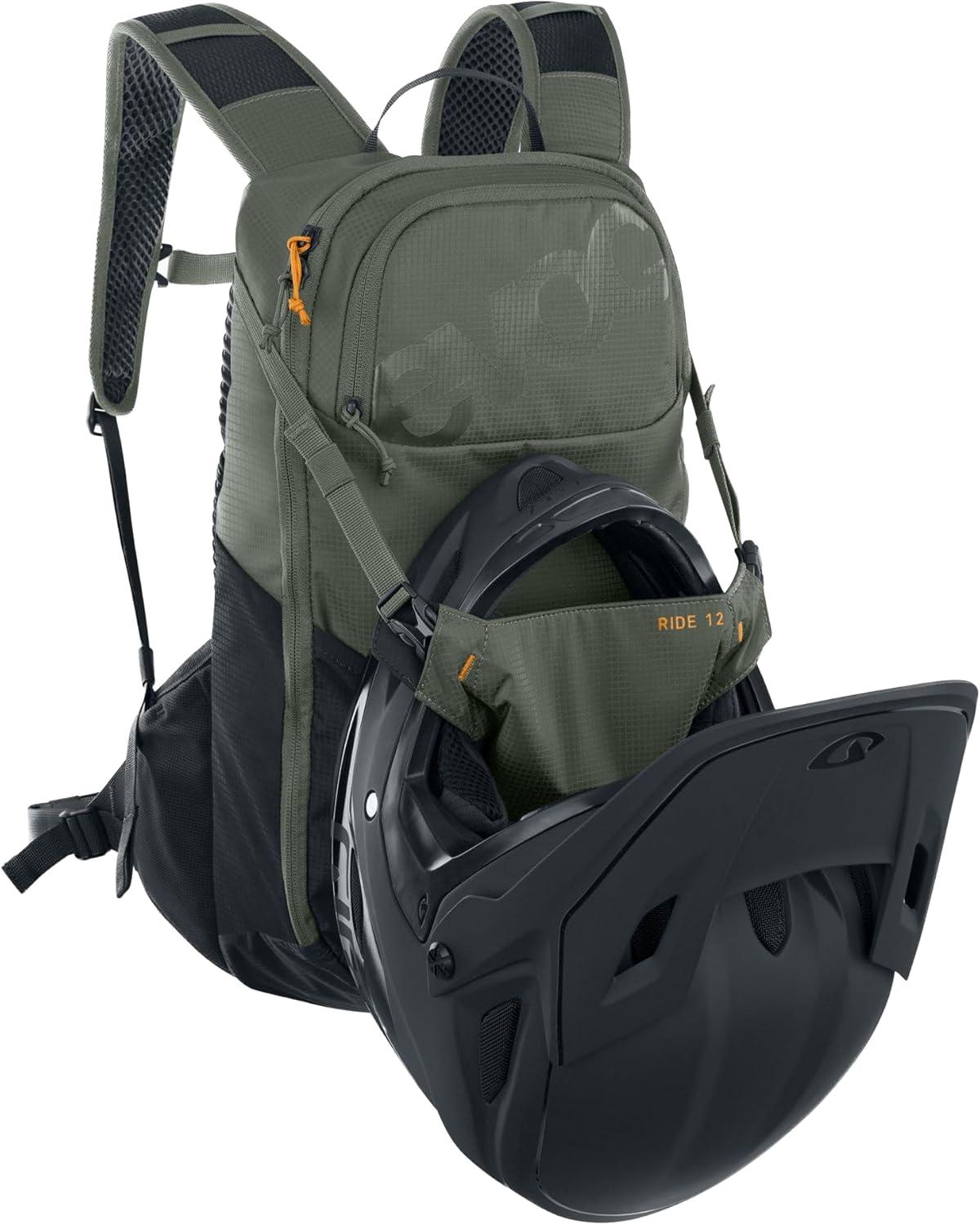 EVOC RIDE 12 bike backpack Bike backpack for trails and other activities (clever pocket management, AIR-PAD back padding, helmet holder, incl. 2l hydration bladder), dark olive – black | DESCRIPTION: The versatile backpack multi-talent with wide hip fins for the perfect hold does just as well when biking as for other uses that demand comfortable storage space. The RIDE 12 by EVOC convinces with a combination of well thought-out storage space and incredible carrying comfort. The bike backpack is thus the perfect companion for MTB tours and other outdoor activities! The bike backpack by EVOC comes with AIR-PAD back padding, which ensures pleasant ventilation of the back. Thanks to an intelligent pocket management, the comfortable storage space of the backpack is used efficiently. The RIDE 12 features a tool compartment with organiser function, an extra compartment for the hydration bladder and a helmet holder. The EVOC RIDE 12 comes with our matching 2 litre HYDRATION BLADDER. | Features: – 2 Step Zip System – Air Circulation – Air Pad System – Body Hugging – Goggle pocket – Extra wide hip wing pocket for mobile phone – Hip belt pocket – Hydration Clip – Mesh ventilation – Emergency plan – Rear light clip – Key clip – Signal whistle – Sunglasses pocket – Hydration system pocket – Food compartment – Tool compartment – XC/DH helmet holder | Details: – Colour: dark olive – black – Size: Onesize – Volume: 12 litres – incl. 2 l HYDRATION BLADDER – Dimensions: 47 x 24 x 10 cm – Weight: 590 g | Material: – N 100/D – SHADOW BOX PU COATED – P200D | Manufacturer: We still test all products ourselves and work every day to make them just that little bit better. Our DNA is in every product and with everything we make we try to convey our passion for sport and travel. EVOC products are therefore always a little bit more than just pieces of equipment. EVOC stands for evolution and the concept for high-quality, sporty backpacks, bags and luggage with a special focus on uncompromising protection of people and material. Protect the things you love! Or more briefly: EVOC – PROTECTIVE SPORTS PACKS