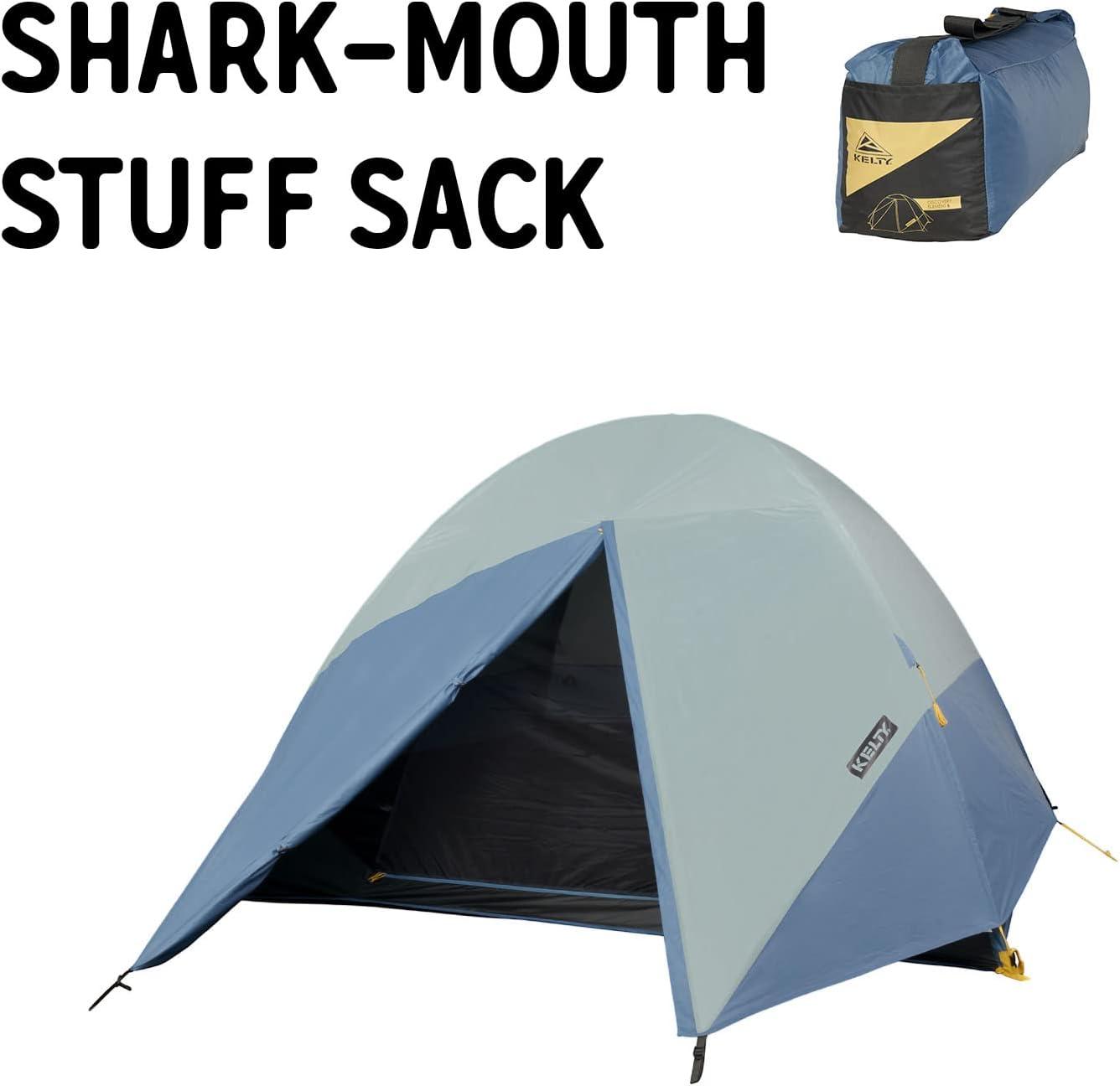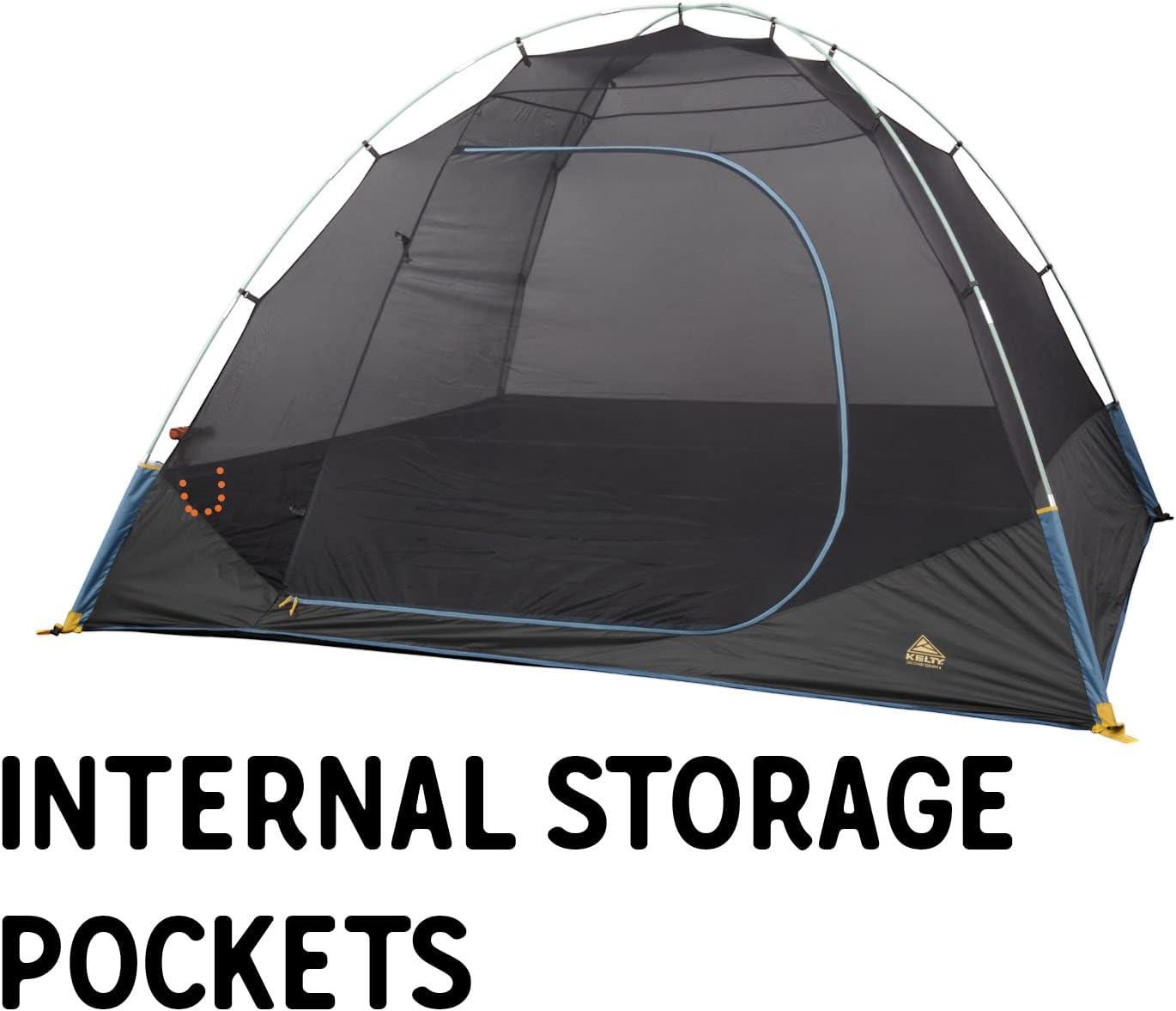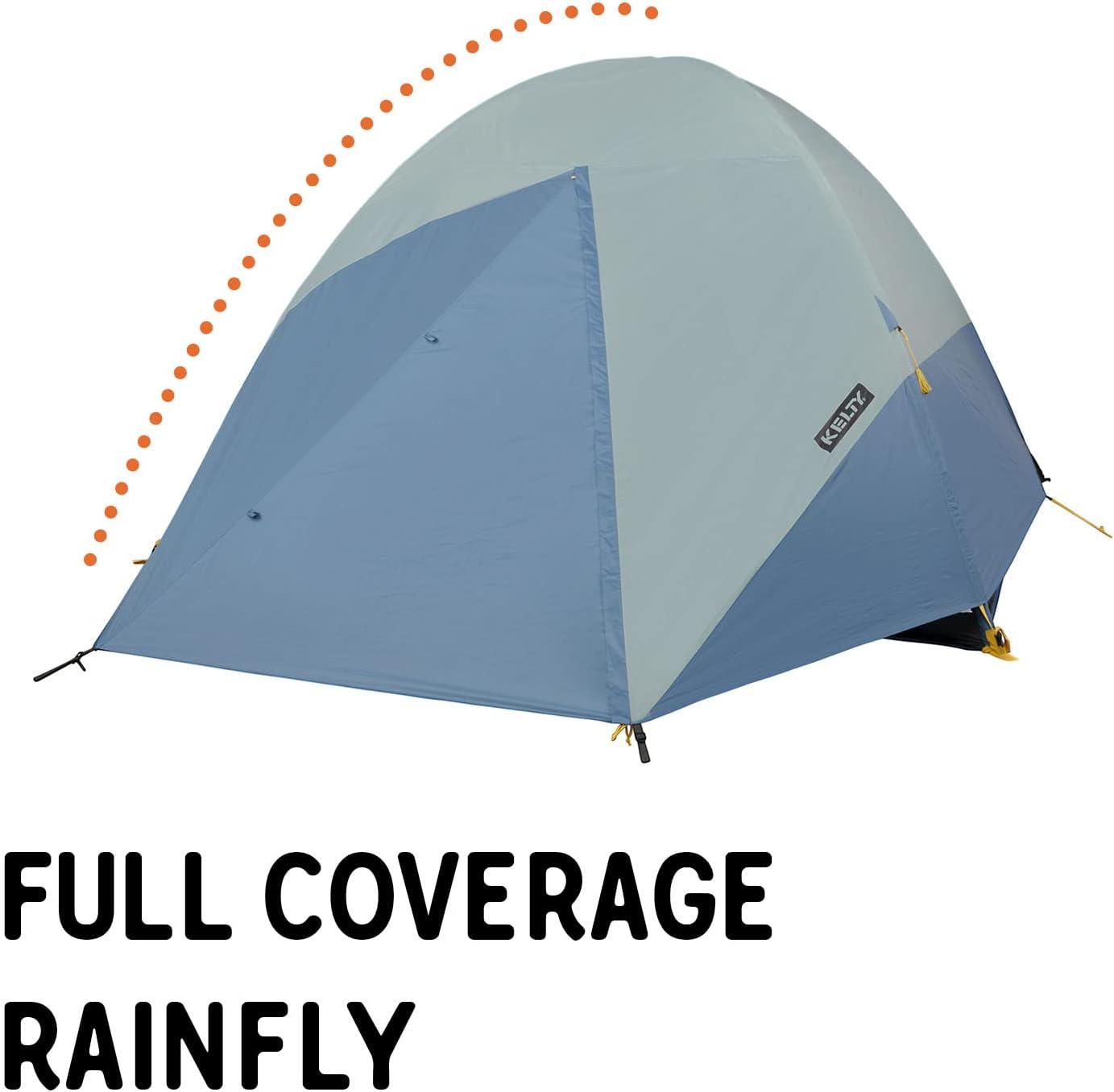 STURDY AND STORM WORTHY CAMP HQ: 2 fiberglass poles provide a robust frame and go up easy with Kelty’s Quick Corners; full coverage rainfly covers you and your gear, guylines stabilize in windy conditions at the campground