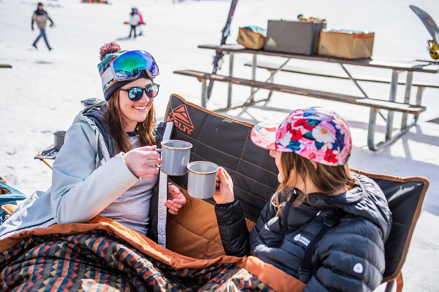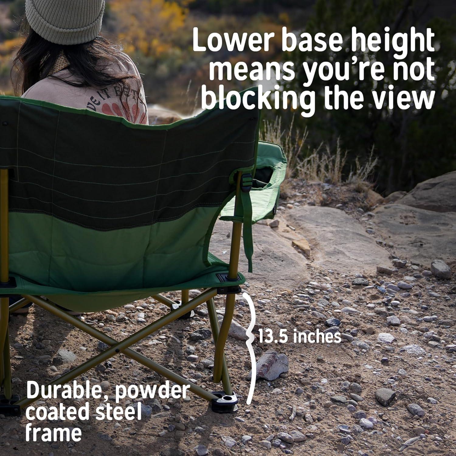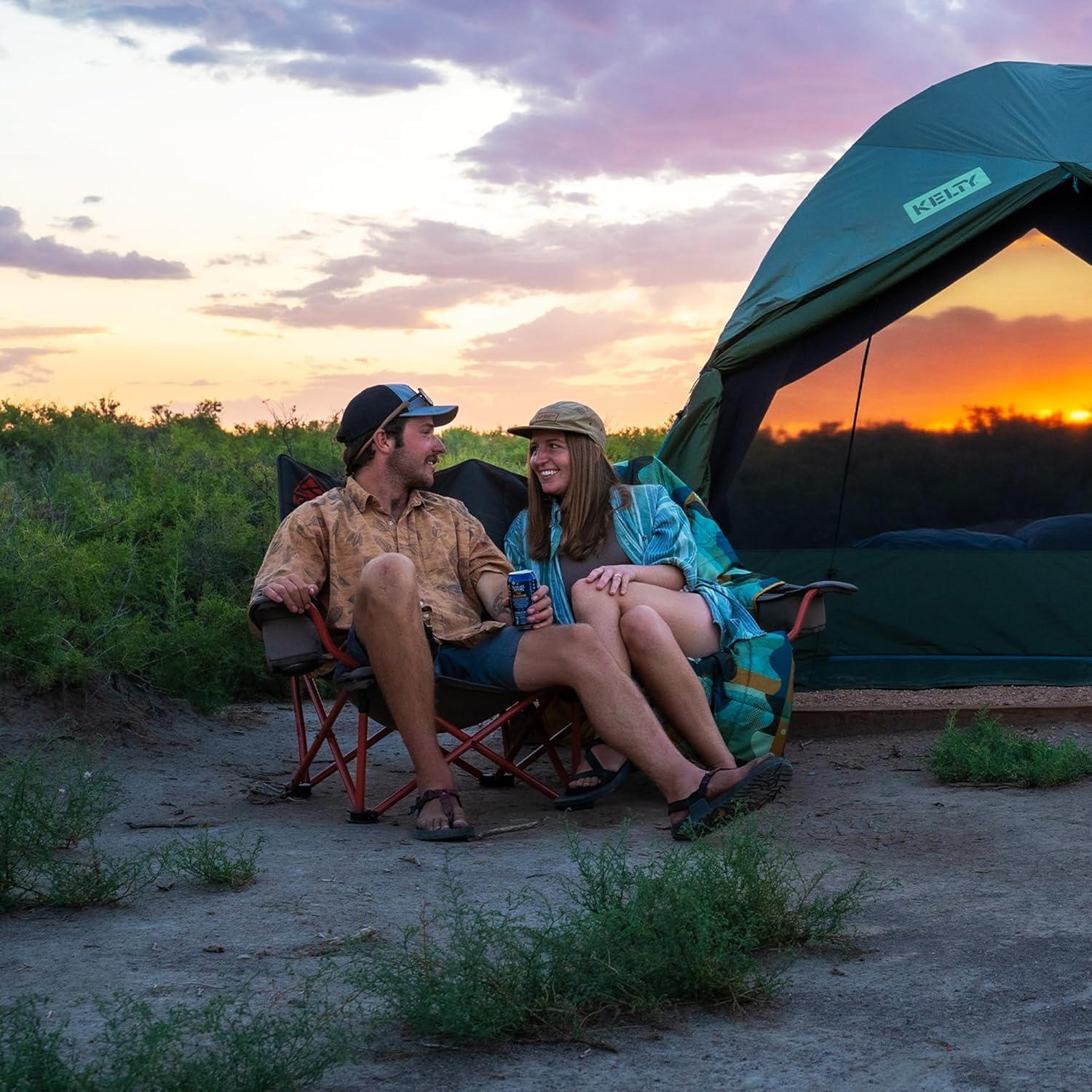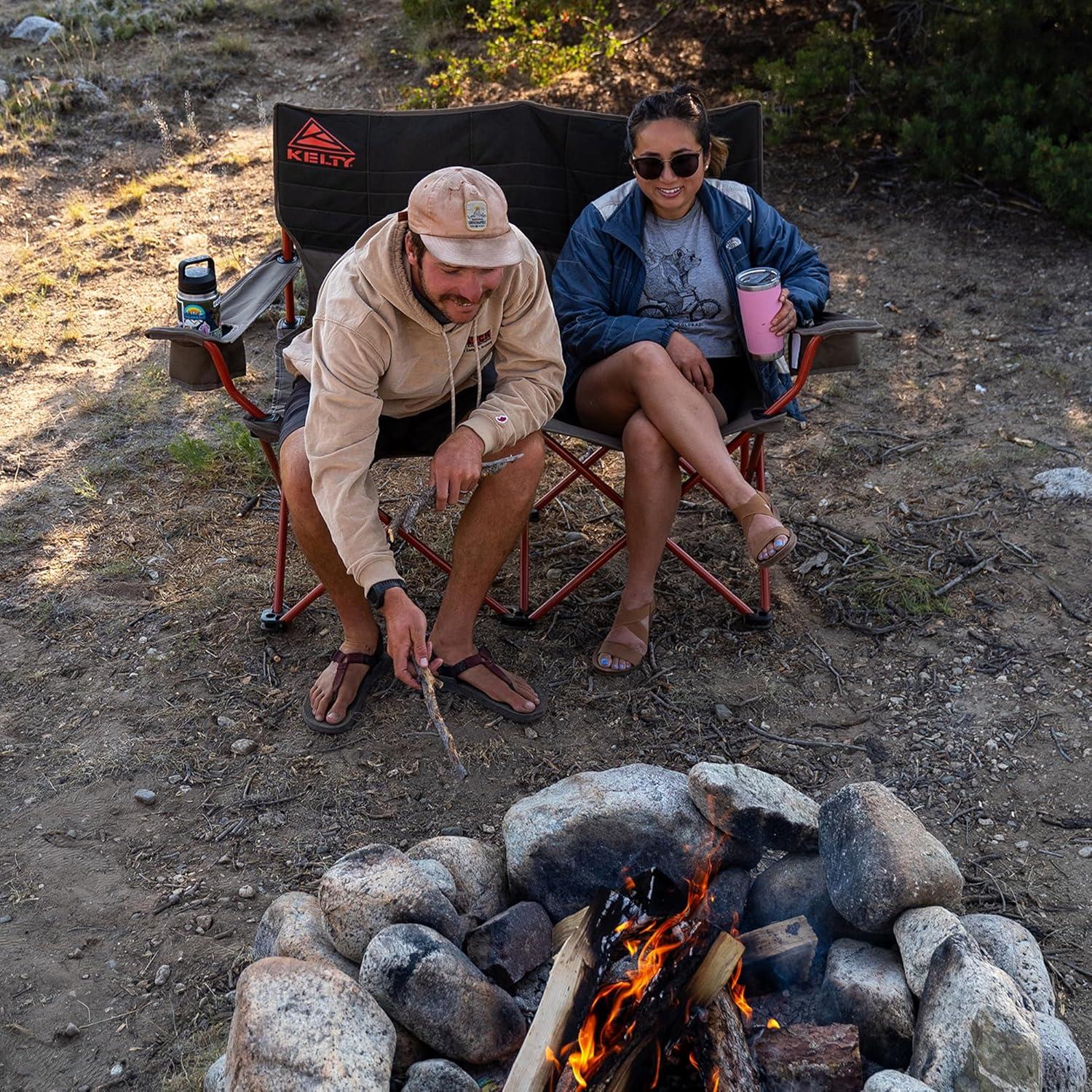 Camp chair, beach chair, bag chair, backyard chill spot chair, stadium seat, the Kelty Loveseat camping chair checks all the boxes. The dog-claw-proof-600D Polyester fabric helps you and yours cuddle up to a campfire without leaving out your furry friend. The two insulated and adjustable holders for beverages and a solid powder-coated steel frame are key material details that help set this chair apart. Armrests are fully adjustable to accommodate a wide range of sizes, and include insulated beverage holders to keep your cold one cold, plus room for extras. The handy carry wrap rolls up for easy-to-use storage and doubles as a padded dog mat for your furry companions.