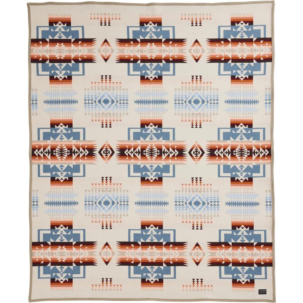 In Native American culture, the gifting of blankets carries deep significance, embodying love, warmth, protection, and often honoring leadership and special occasions. Echoing this tradition of respect and meaningful exchange, experience the perfect blend of heritage, luxury, and durability with the Chief Joseph Jacquard Blanket, Pendleton’s longest-running pattern. Designed to honor the bravery and leadership of Chief Joseph, this wool blanket features directional crosses and arrows, symbolizing strength, courage, and a journey forward.Crafted from a premium virgin wool and cotton blend, this wool throw blanket offers a plush feel, warmth, and breathability, making it perfect for year-round comfort. The napped finish creates a plush, cozy texture, enhancing the depth and richness of its intricate design.Finished with durable wool felt binding, this travel blanket is built to last. The binding adds structure, resists wear, and provides a polished, refined edge, complementing the soft wool’s natural beauty. Enjoy the visual interest of two distinct designs in one beautifully crafted piece. This thoughtful feature enhances its visual appeal but also provides greater versatility for your home or personal use. Whether draped over your bed, wrapped around you by the fire, or taken on outdoor adventures, this outdoor blanket delivers timeless warmth and comfort wherever you go.Proudly woven in Pendleton’s American mills, this Made in USA masterpiece reflects a commitment to quality craftsmanship. This Western blanket is more than just a piece of décor—it’s a lasting tribute to history, artistry, and enduring comfort. A worthy investment for yourself or a meaningful gift for someone special.
