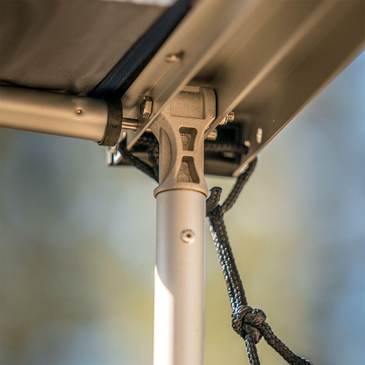 When we roll up to that perfect site—mountain views, babbling brook, vibrant wildflowers—we put our steed in park and setup up the 8ft Rooftop Awning. The rugged canopy unfurls from its weatherproof cover to shield us from crisping rays as we soak up nature's colors and sounds.